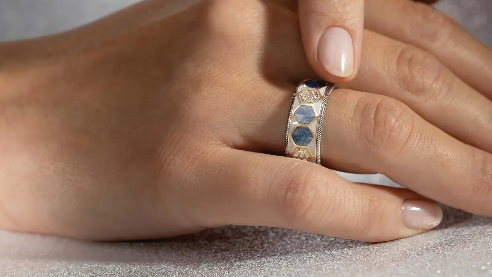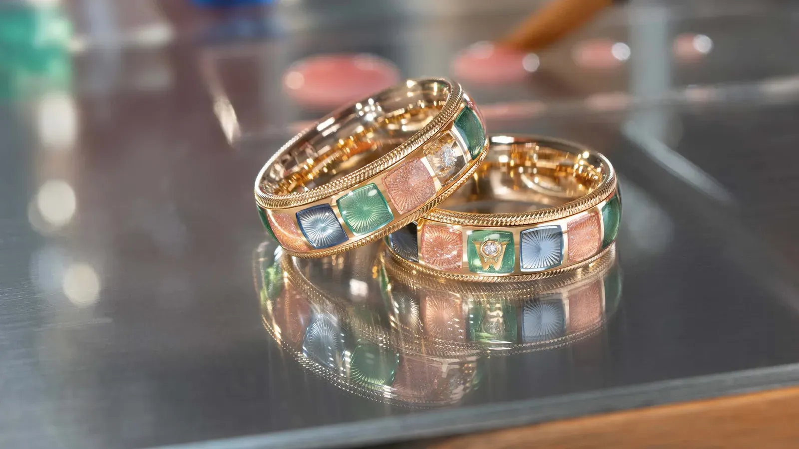 Mehrschichtige Kaltemaille in opaken und transparenten Farben, veredelt mit mikrofeinen Kristallpartikeln.