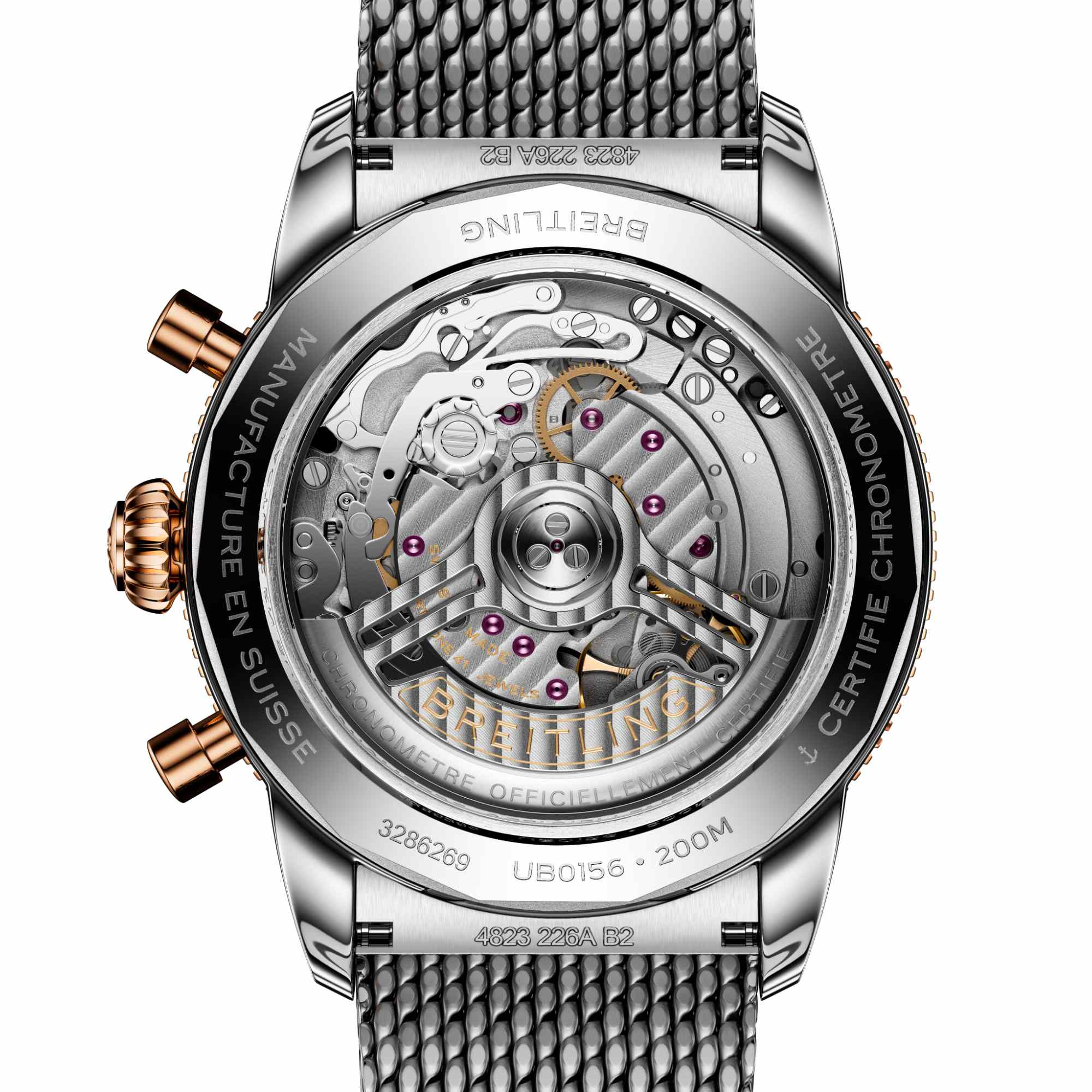 Auch heute noch ist diese Philosophie das Herzstück der Superocean Heritage. Die Seele der 50er Jahre, aber im neuen Kleid für die Gegenwart. Die neueste Superocean Heritage baut auf allem auf, was das Original unverwechselbar gemacht hat, und verfeinert es. Der Chronograph wird vom Breitling-Manufakturkaliber 01 angetrieben, dem branchenführenden Uhrwerk von Breitling. Eine Lünette mit Keramikeinlage bietet außergewöhnliche Kratzfestigkeit, während die integrierten Armbänder aus Mesh-Metall oder Mesh-Kautschuk eng am Gehäuse anliegen und mit Faltschließen für ein sauberes, wasserdichtes Finish gesichert werden. Ton-in-Ton-Hilfszifferblätter, ein diskretes Datumsfenster auf sechs Uhr und die originalen Signaturzeiger Pfeil für die Stunden, Speer für die Minuten – sorgen für Ablesbarkeit und Ausgewogenheit, über oder unter der Oberfläche.