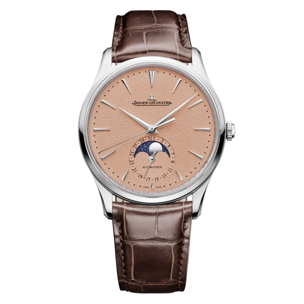 Ref. 1368460 - Mit ihrem 39 mm großen Edelstahlgehäuse mit nur 9,3 mm Höhe steht die Master Ultra Thin Moon für raffinierte Eleganz. Das kupferfarbene Zifferblatt mit gekörnter Textur überzeugt durch eine ausgewogene Symmetrie – die Mondphasenanzeige fügt sich elegant bei 6 Uhr ein. Die ikonischen Dauphine-Zeiger mit polierten und gebürsteten Flächen treffen auf verlängerte, trapezförmige Indizes – gemeinsam schaffen sie ein faszinierendes Spiel des Lichts. Das braune Alligatorlederarmband mit Edelstahl-Faltschließe lässt sich im Handumdrehen austauschen – für noch mehr Vielseitigkeit. Auf der Rückseite offenbart sich das aufwendig veredelte Manufaktur-Kaliber 925 – entworfen und montiert unter einem Dach in der Grande Maison, mit anglierten Kanten, Genfer Streifen und gebläuten Schrauben.