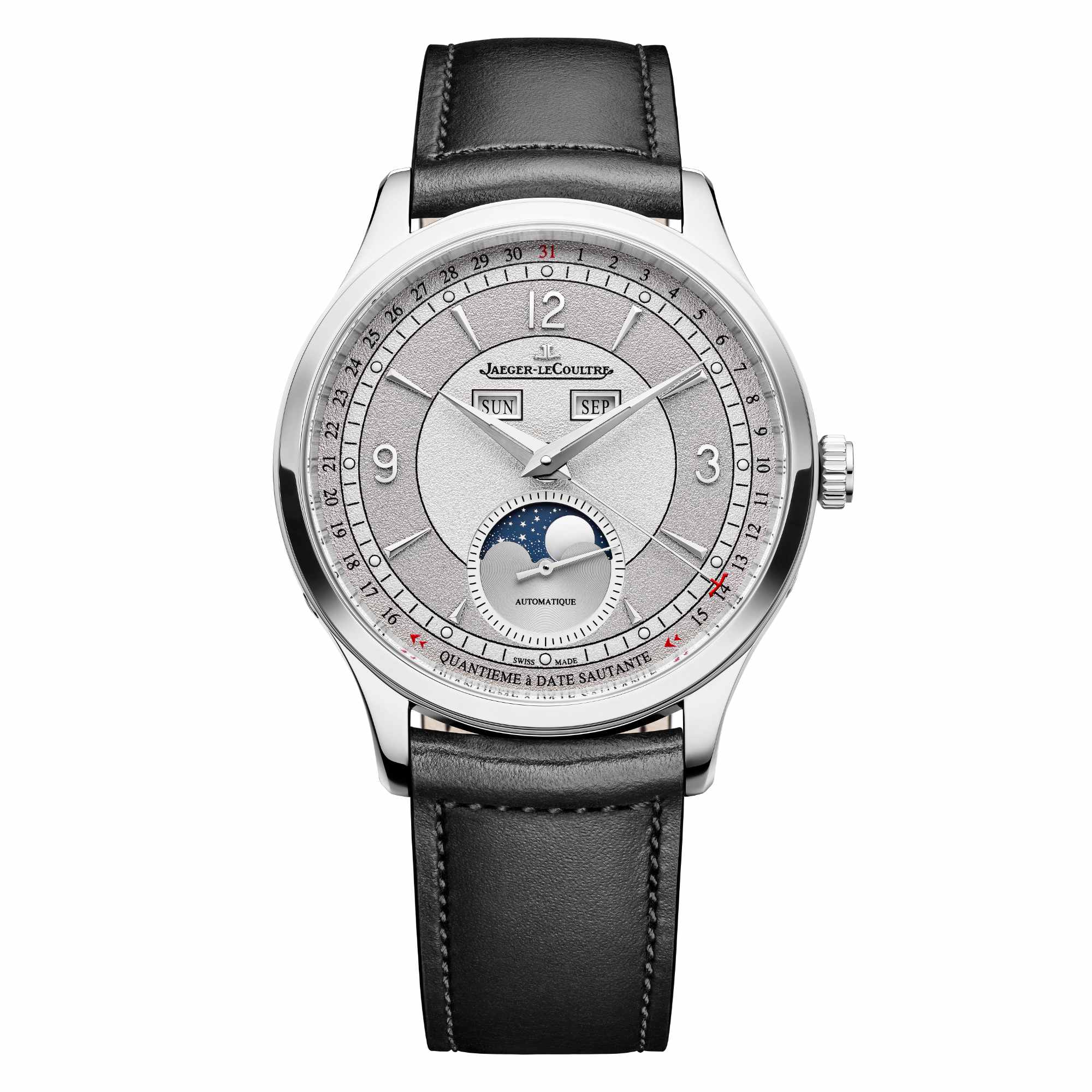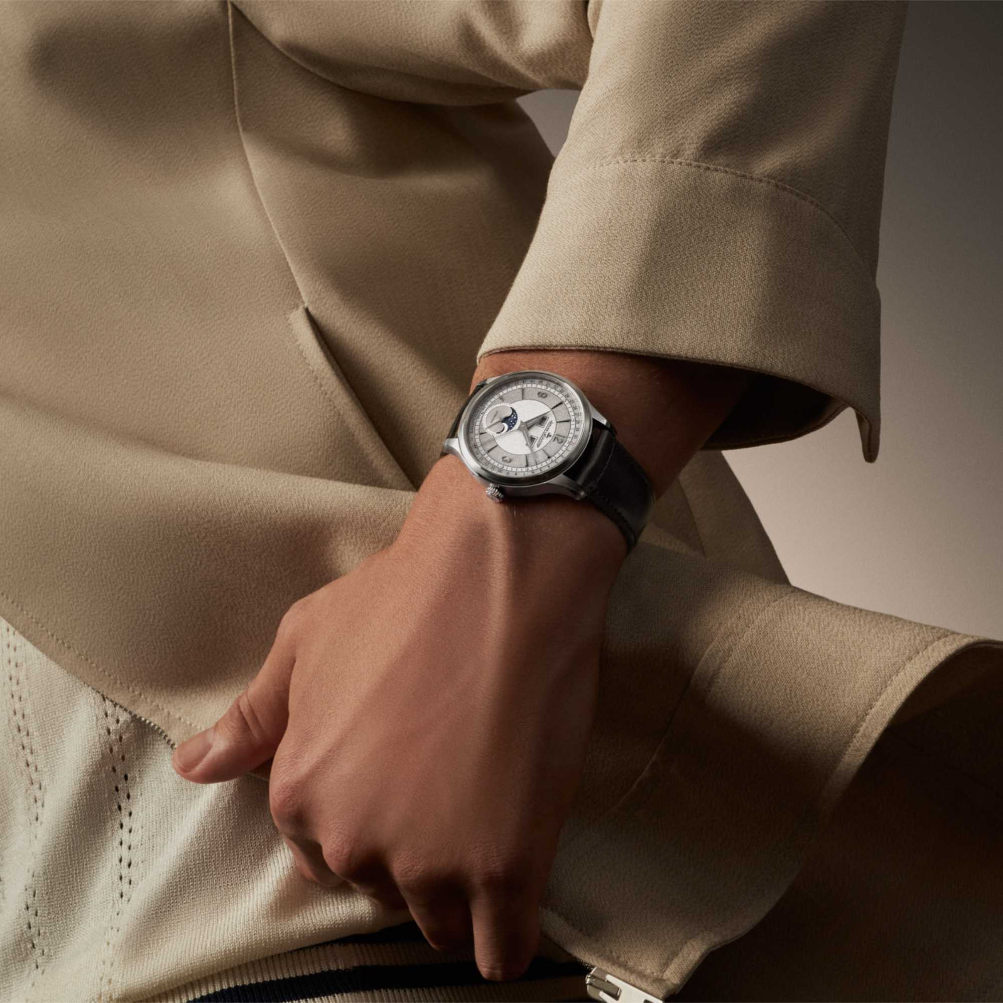 Ref. 4148450 - Die limitierte Edition der Master Control Calendar 2025 besticht durch ein Zifferblatt, das mit subtiler Textur und feinen Grauschattierungen spielt: Eine fein gekörnte Oberfläche wechselt zwischen zwei Grautönen, die in konzentrischen Ringen angeordnet sind – für ein Ergebnis von eindrucksvoller Tiefe und komplexer Raffinesse. Die Tages- und Monatsanzeigen greifen den Grauton des Zifferblatts auf und fügen sich nahtlos in das harmonische, moderne Gesamtbild ein. Im Wechselspiel des Lichts erwachen die zarten Farbunterschiede zum Leben, während der Minutenring und die Dauphine-Zeiger mit Super-Luminova® versehen wurden und dezent im Dunkeln leuchten. Die springende Datumsanzeige zwischen dem 15. und 16. Tag fällt mit ihrer ankerförmigen Spitze – eine subtile Erinnerung an das Logo der Maison – in leuchtendem Rot sofort ins Auge. Dieses kleine Detail von großer Raffinesse erleichtert die Ablesbarkeit der Anzeigen. Erfassen Sie alle Nuancen der Zeit mit diesem ausgesprochen modernen Zeitmesser, der in einer limitierten Auflage von 500 Exemplaren hergestellt wurde.