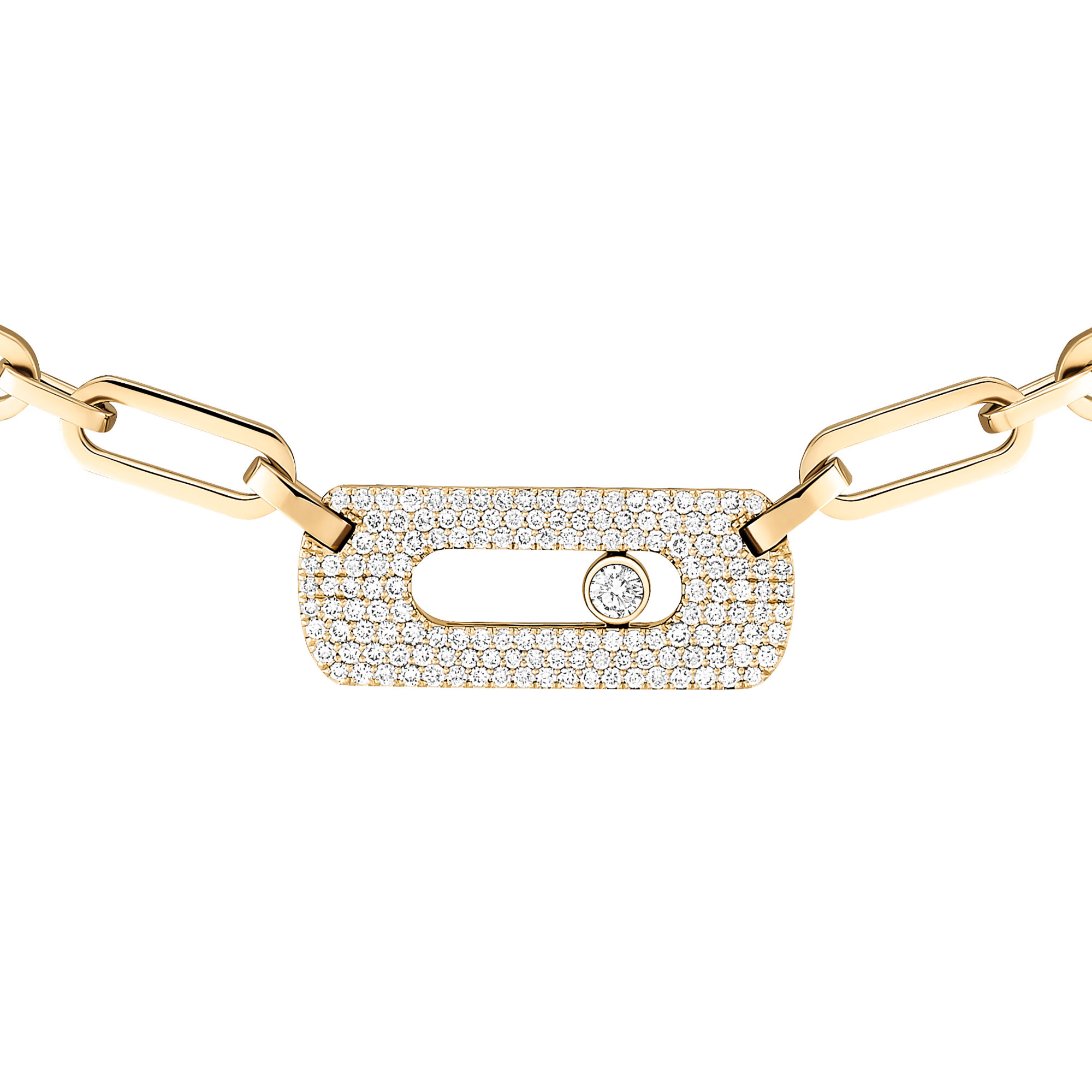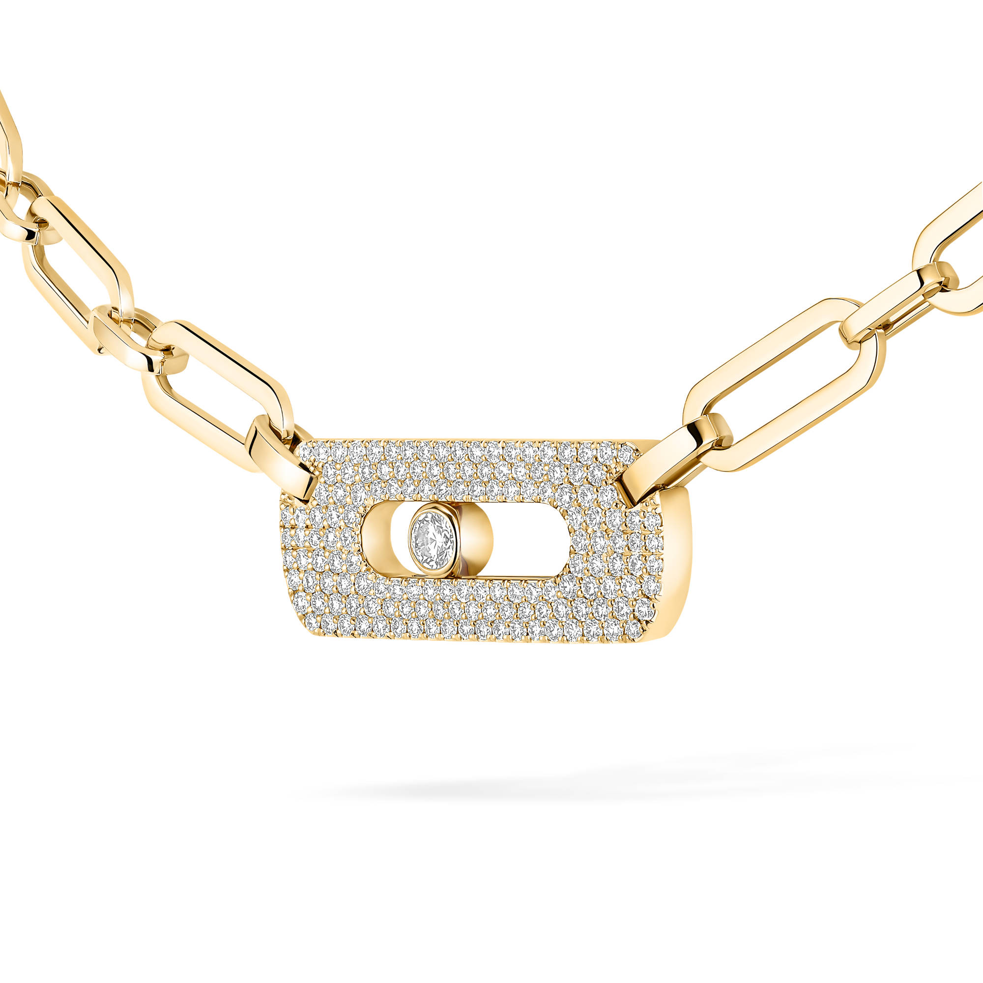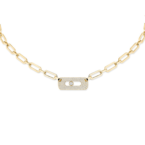 Ref. 12095-YG - Platz für selbstbewusste eng anliegende Halsketten. Gliederketten sind die absoluten Schmuckklassiker der 60er Jahre und feierten bereits in den 80ern ihr großes Comeback. Ihre XXL-Ketten peppen sofort jeden Stil auf. Das kraftvolle Design und die eleganten Proportionen machen die eng anliegende Move Link Diamantkette zu einem unschlagbaren Must-have in Ihrem Schmuckkästchen. Die handgefertigte Kette zeigt sich in sonnigem Gelbgold. Im Mittelpunkt steht das zentrale Motiv mit dem beweglichen Diamanten, dem Markenzeichen der Juweliermaison Messika. Ein grafisches Damenschmuckstück, das Eleganz und einen Hauch Rock kombiniert.