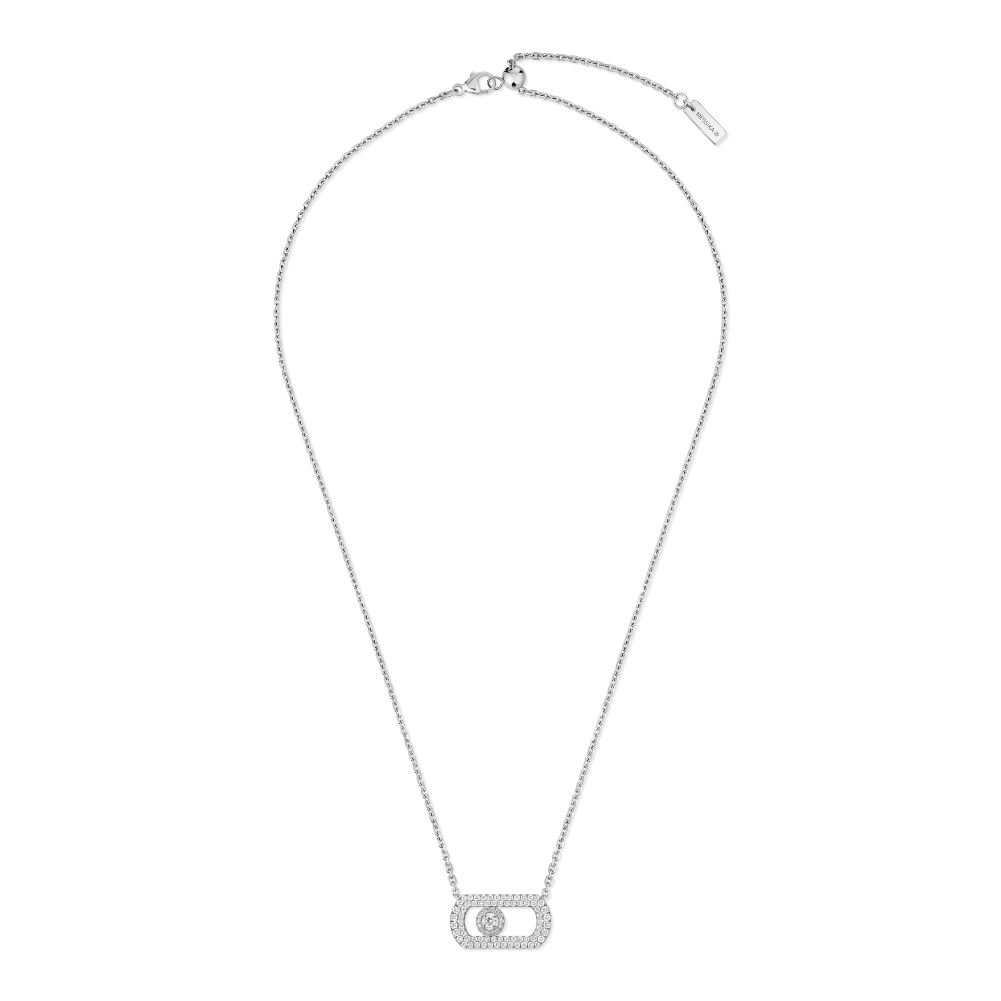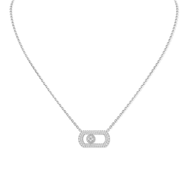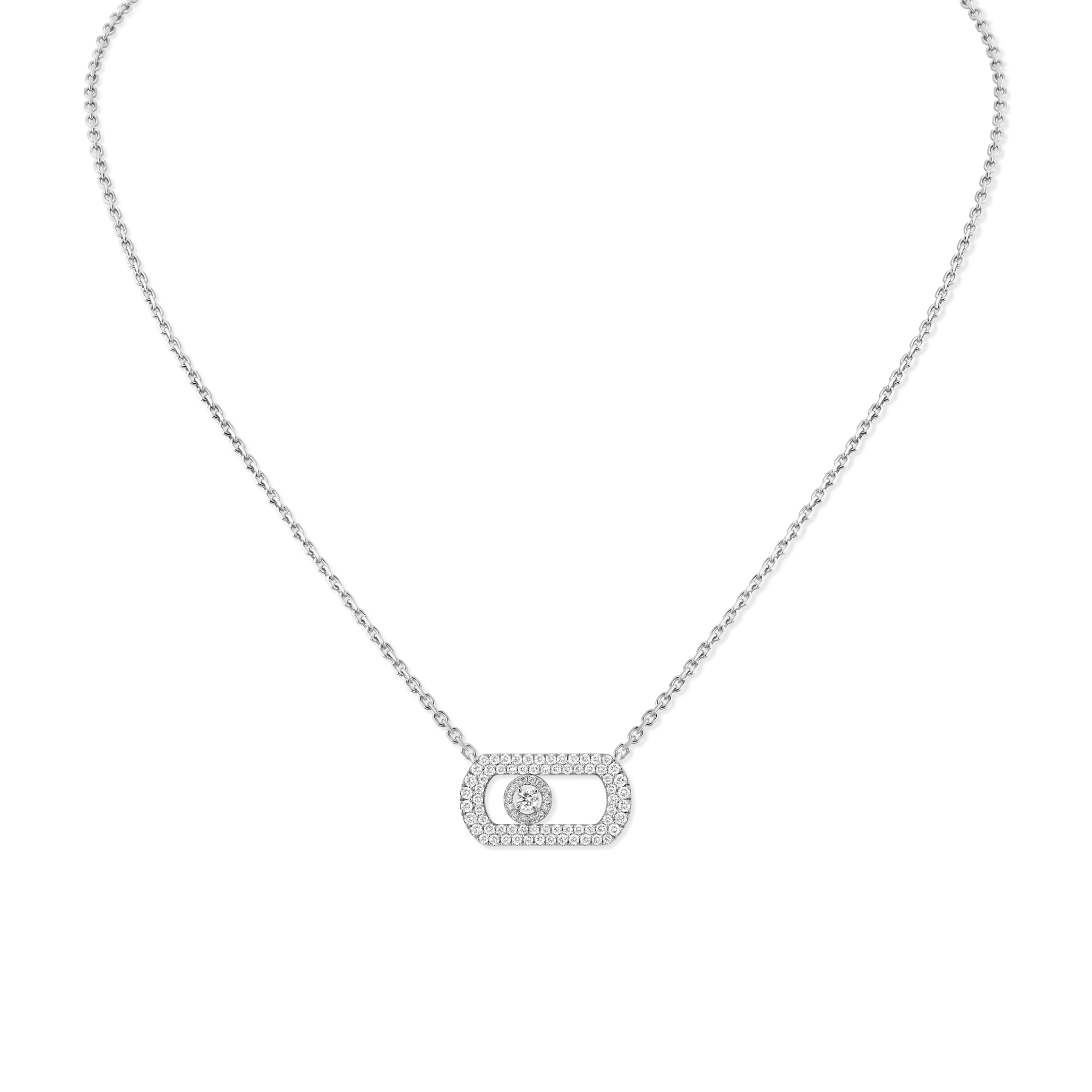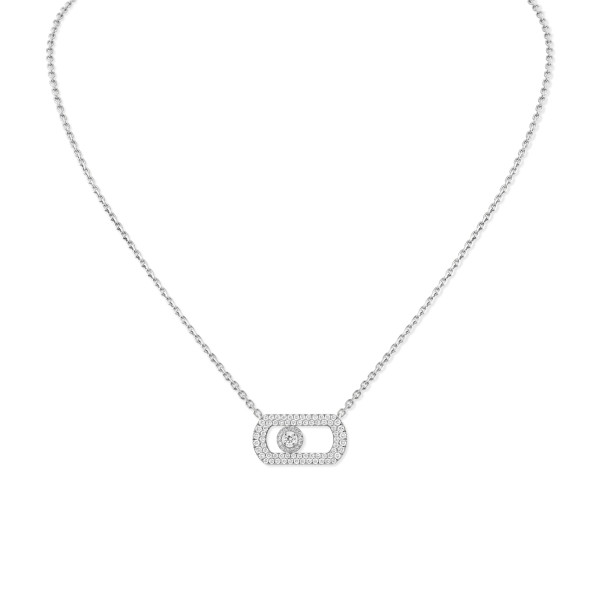 Ref. 12945-WG - Wenn Sie nach der ultimativen statuarischen Anhängerkette suchen, dann suchen Sie nicht weiter! Die So Move Diamantkette aus Weißgold ist die Messika Kreation, die Sie brauchen! Das Kultmotiv der Maison erfindet sich in einer noch kühneren und selbstbewussteren Version neu. Valérie Messika verleiht dem beweglichen Diamanten eine völlig neue Dimension mit skulpturaleren Konturen und einem beweglichen Diamanten, der dank seiner mit Diamanten besetzten Umgebung noch imposanter wirkt. Dieses neue Must-have für die Schmuckschatulle gibt es auch in Gelbgold und Roségold.