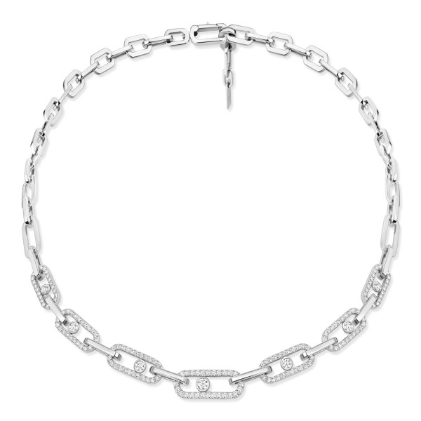 Ref. 14042-WG - Das Spiel mit dem Volumen und das intensive Funkeln der Diamanten verleihen dieser Gliederkette aus Weißgold einen außergewöhnlichen Glanz. Mit der Move Link Schmuckkollektion interpretiert Messika das Move Kultmotiv in modischen Kreationen mit Gliederketten-Effekt neu. Das Motiv bildet eine starkes und gleichzeitig geschmeidiges XXL-Glied, das hier durch den extremen Glanz der sieben vollständig mit Diamanten ausgefassten Motive unterstrichen wird. Die Move Link Halskette ist ein Schmuckstück voller Licht in makellosem Weiß und verleiht Ihrem Look eine einzigartige Verwegenheit und Eleganz.