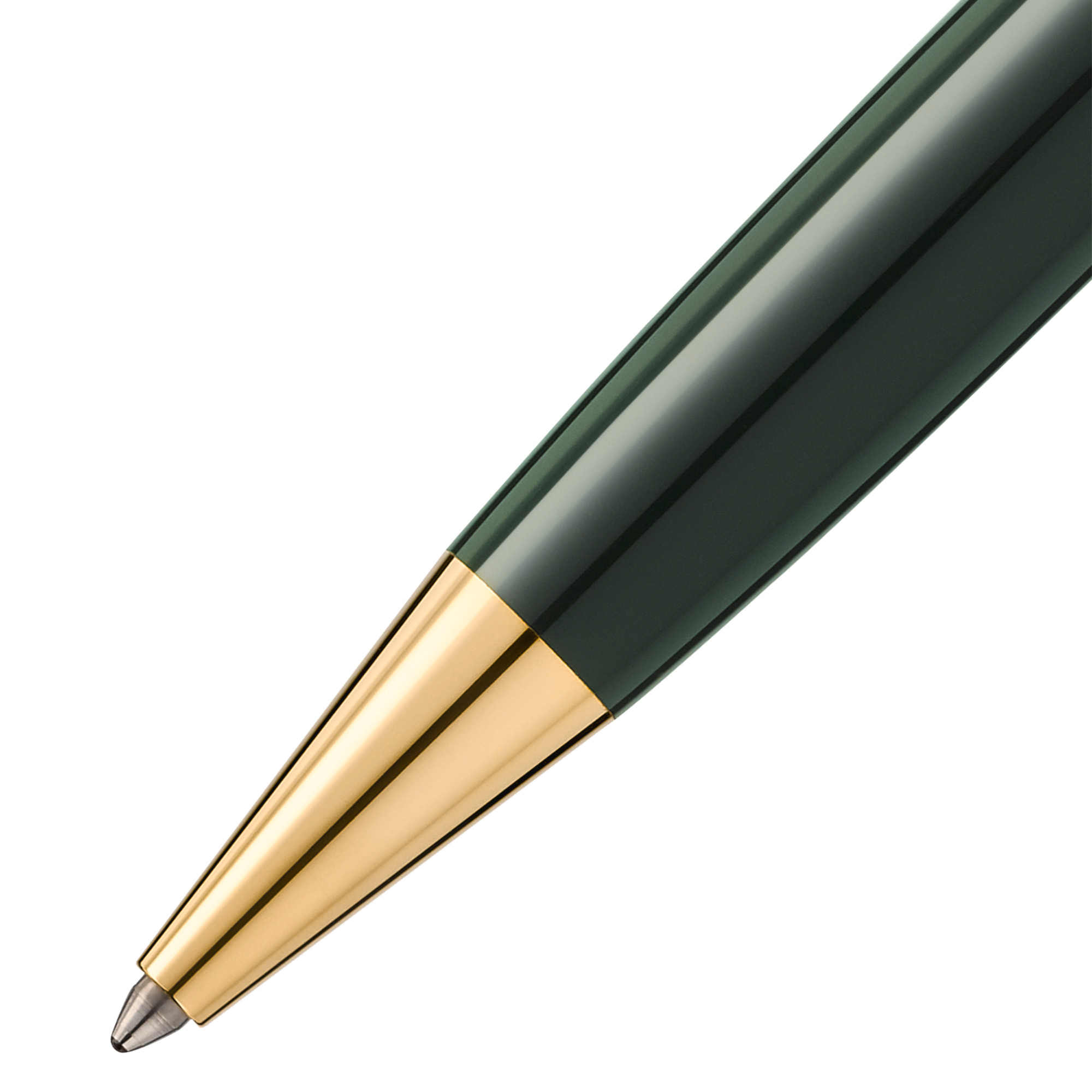 Ref. MB131344 - Die kunstvoll aus dunkelgrünem Edelharz gefertigte Kappe zeichnet sich durch ein fließendes Muster aus, das von Kreationen früherer Tage inspiriert ist und das Auflösen von Tinte auf Papier zeigt. Es bildet einen zauberhaften Kontrast zu den vergoldeten Beschlägen. Der Clip ist eine Hommage an die frühen Clipformen, die einige der ersten Meisterstück Schreibgeräte auszeichnen, und verströmt eine gewisse Nostalgie. Bei genauerem Hinsehen entdeckt das ursprüngliche Meisterstück Logo, das seit seiner Einführung die Kappe als Symbol für höchste Qualität ziert. Verziert ist diese Jubiläumsedition mit einem speziellen Kappenring, der die Jahre 1924 und 2024 zeigt. Auf weitere 100 Jahre höchsten Anspruch mit dem Meisterstück!