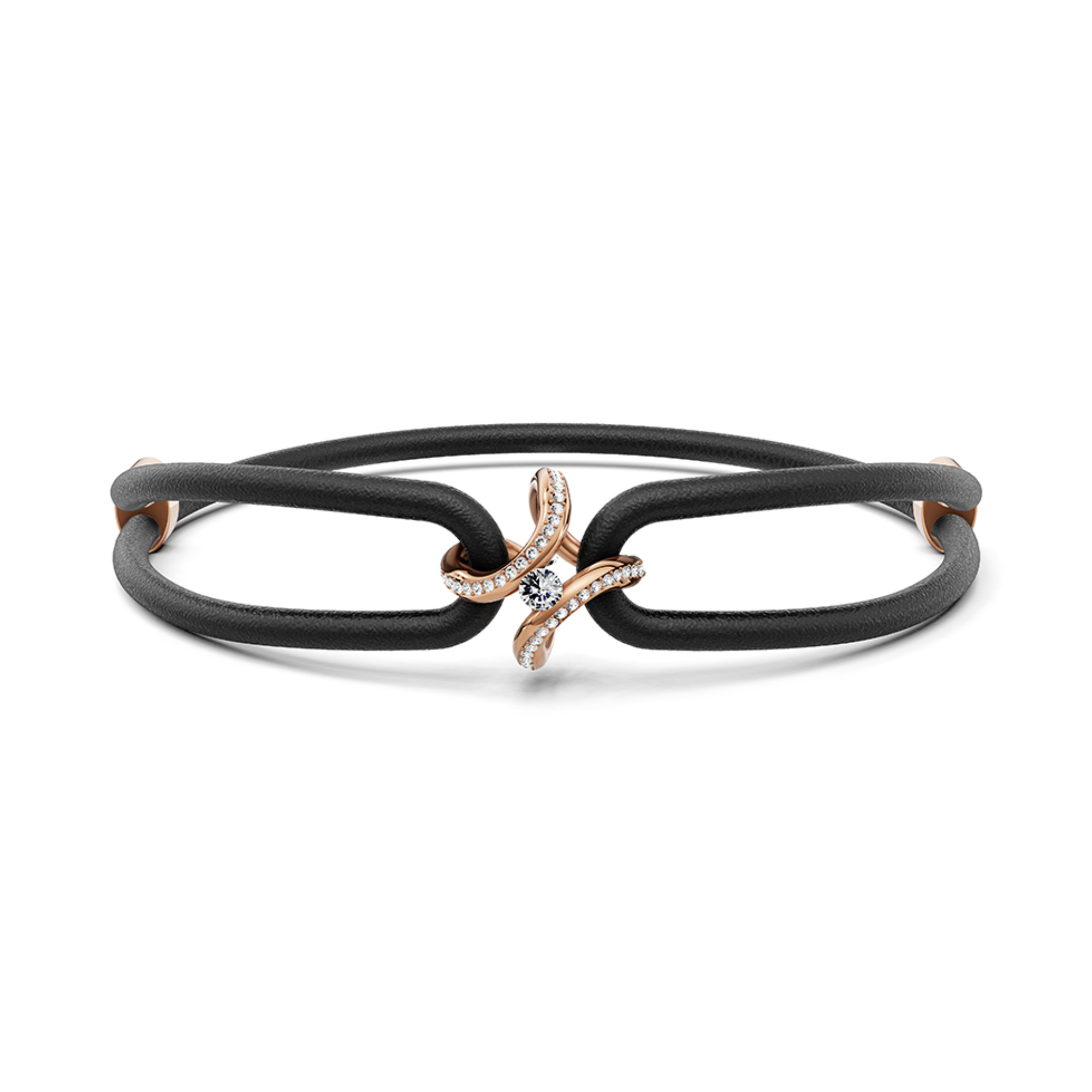Ref. N392915-black-cr - Der Niessing Spannring® Ära Armschmuck verkörpert eine Hommage an die Ur-Form des Niessing Spannrings, interpretiert auf spektakuläre Weise neu. Die ikonische Form, organisch zu zwei feinen Bögen geschwungen, hält gleich zwei Brillanten sanft und sicher fest. In der Ausführung Highlights wird der Bandverlauf üppig mit Brillanten kunstvoll ausgefasst. Das doppelt geschlungene, feine Lederband wiederholt die unendliche Form und macht den Armschmuck zu einem stilvollen Begleiter für jeden Tag – extravagant, lässig, schwungvoll und leicht. Eine Fusion aus moderner Lässigkeit und ikonischem Design, bereit für das Original einer neuen Ära.