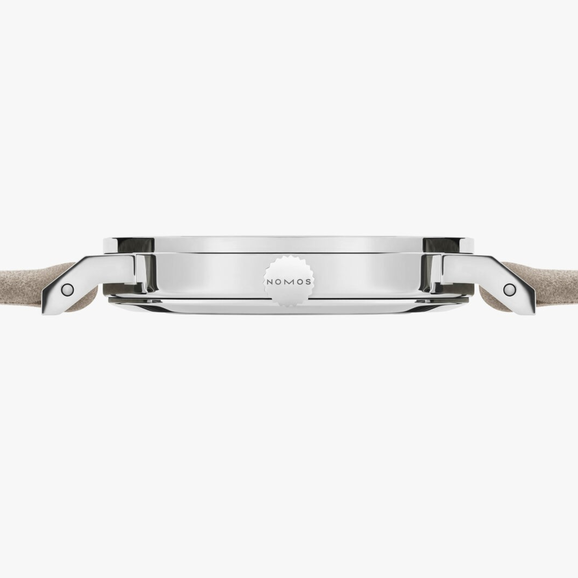 Ref. 122 - Tangente, die berühmteste NOMOS-Uhr, hier in Kleiner, Feiner: Dieses Modell vereint klare Linien, rechte Winkel und feinste Proportionen auf nur 33 Millimetern Durchmesser. Im Innern tickt Handaufzugswerk Alpha und am Handgelenk kommt ein zartes Band aus braunem Veloursleder zum Tragen.