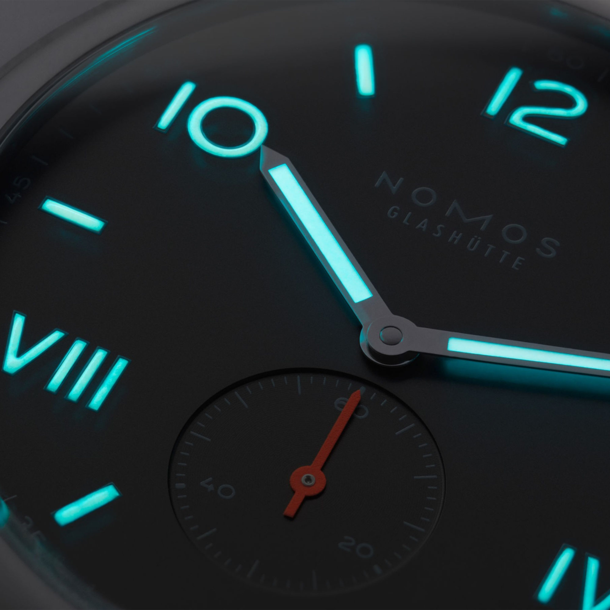 Zeiger: Stunden- und Minutenzeiger rhodiniert und mit Superluminova ausgelegt (blau nachleuchtend); Sekundenzeiger neon-orange
