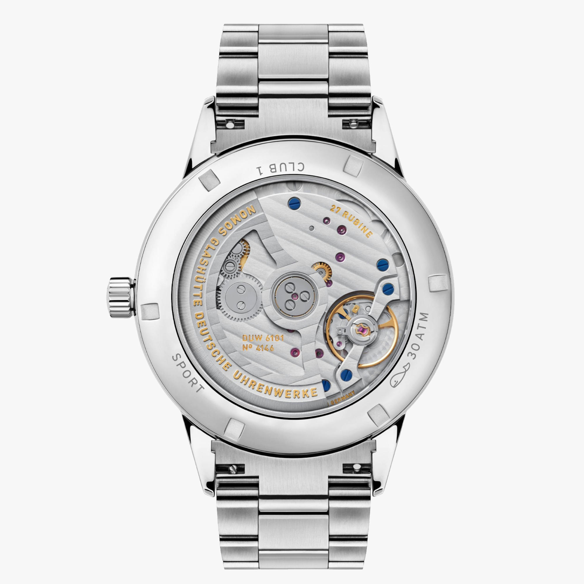 rhodinierte Werkoberflächen mit Glashütter Streifenschliff und NOMOS-Perlage