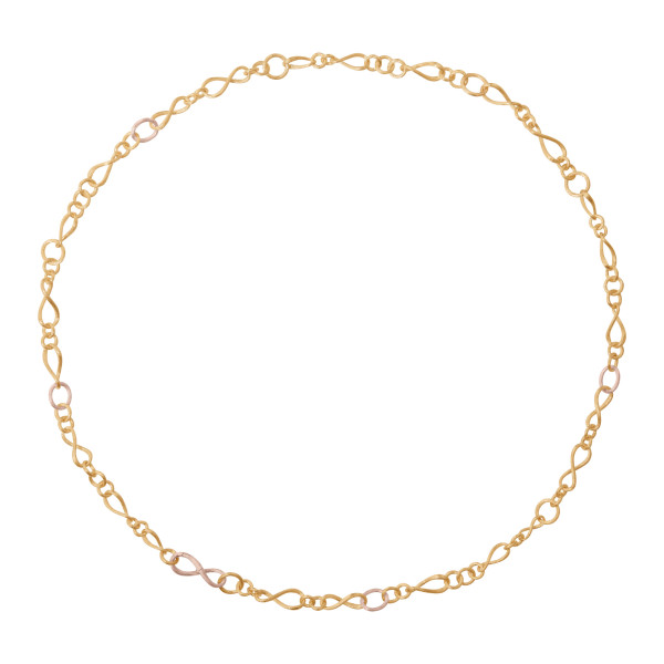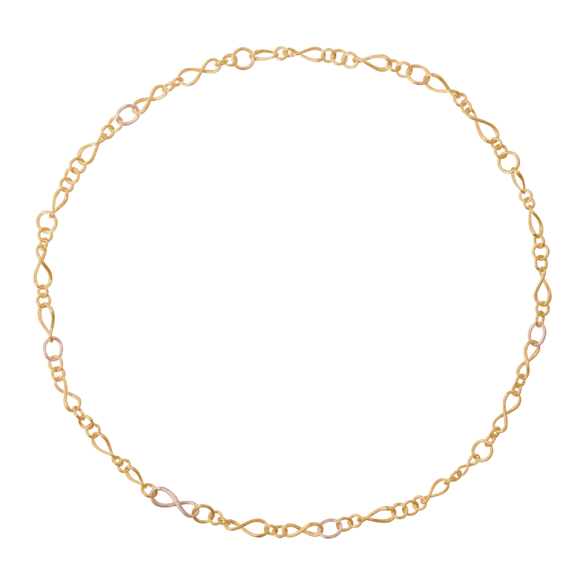 Ref. A1730-405 - Das von Charlotte Lynggaard entworfene Collier Love klein ist aus 18 Karat Gelb- und Roségold gefertigt. Die Gesamtlänge beträgt 80 cm, und die einzelnen Glieder sind unterschiedlich groß. Goldschmiedemeister satinieren die Goldoberflächen von Hand. Teil der Love Kollektion.