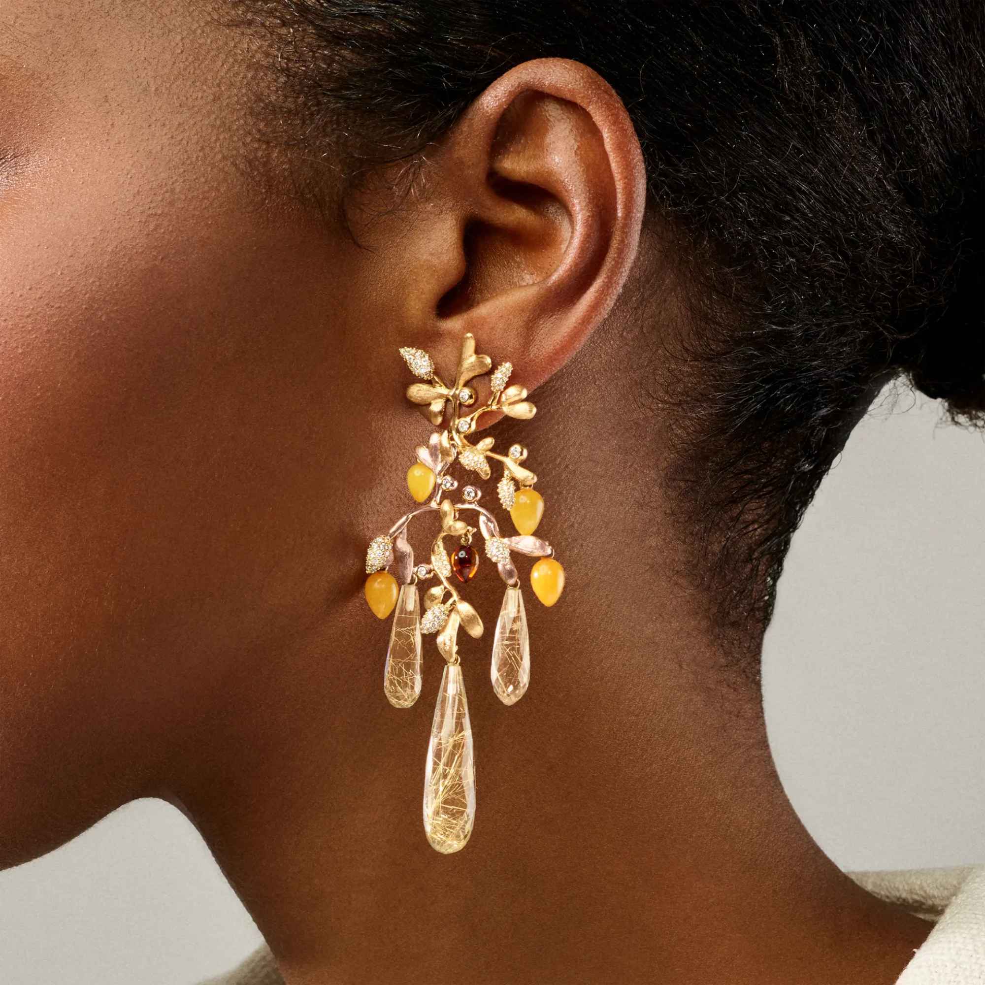 Ref. A9996-457 - Die von Charlotte Lynggaard entworfenen Gipsy Ohrringe sind aus 750/- Gelb- und Roségold, 12 Diamanten im Brillantschliff, 276 Diamanten in Pavé-Fassung von insgesamt 1,35 carat TW. VS. gefertigt. Die Tropfen im Cabochonschliff bestehen aus Rutilquarz und Bernstein. Die sichtbaren Goldflächen werden von Goldschmiedemeistern von Hand satiniert. Gesamtlänge: 8,5cm. Als Paar zu erwerben. Teil der Gipsy Collection.