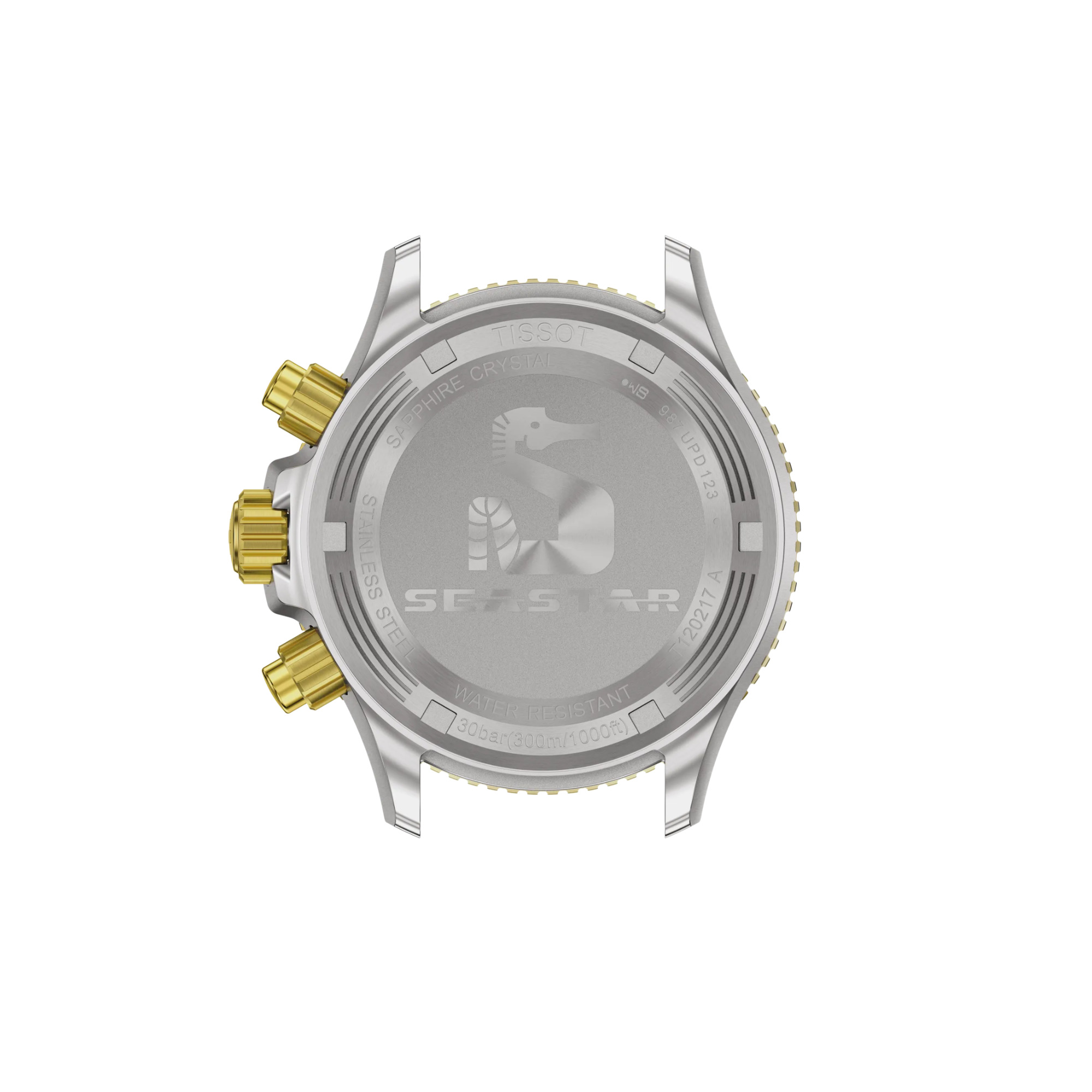 Dieses Tissot Seastar 1000 Quarz 38mm Chronograph Modell in Bicolor-Ausführung verfügt über ein 316L-Edelstahlgehäuse mit gelbgoldfarbener PVD-Beschichtung. Es besitzt einen schwarzen Mineralglas-Lünettenring und ein Zifferblatt mit Farbverlauf von Grau nach Schwarz. Das ebenso massive wie flexible 316L-Edelstahlarmband mit Schnellwechselsystem – ebenfalls mit gelbgoldfarbener PVD-Beschichtung versehen – hält die Uhr dank Sicherheitsfaltschließe mit Drückern elegant und sicher am Handgelenk