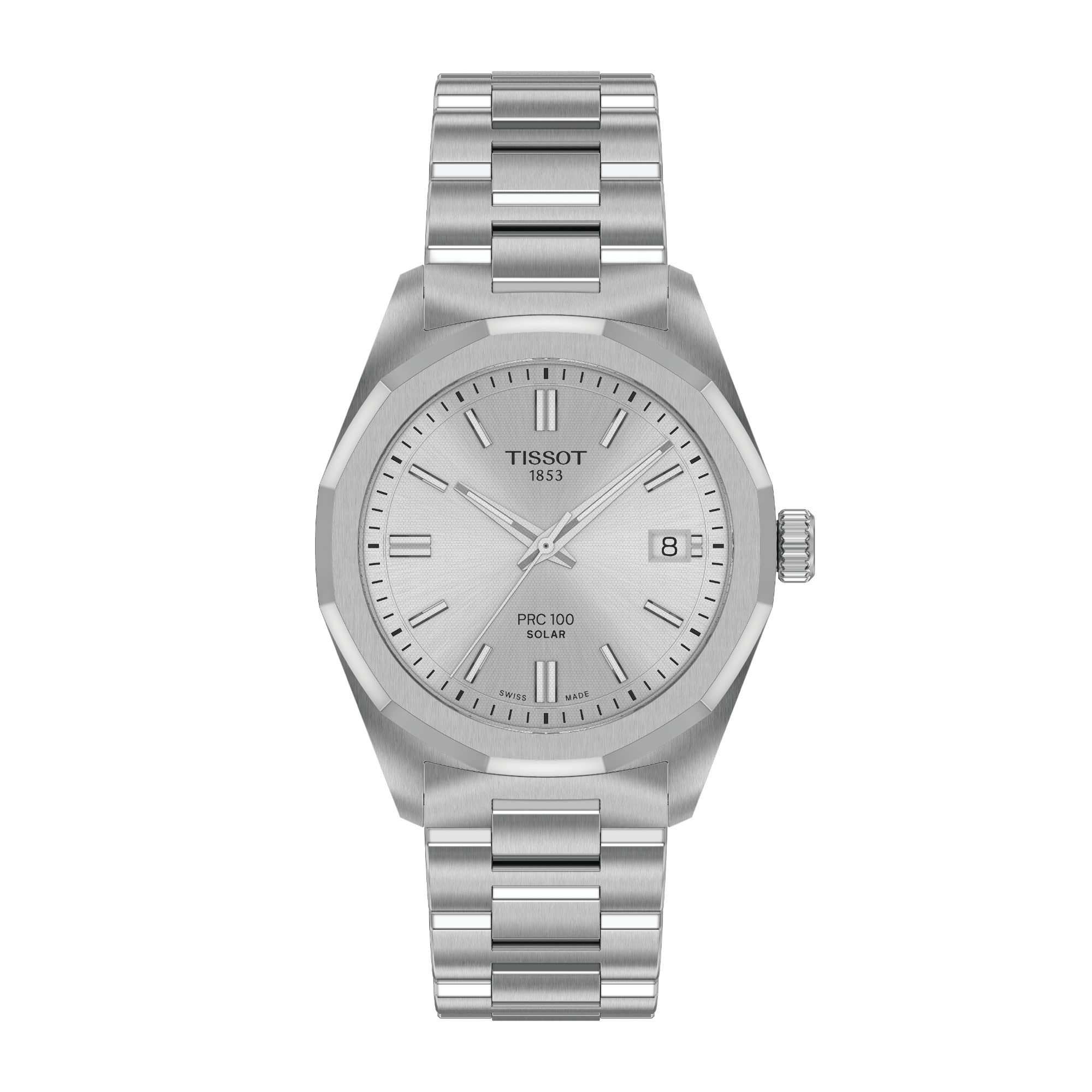 Mit seinem 34 Millimeter messenden 316L-Edelstahlgehäuse und der markanten, zwölfeckigen Lünette strahlt dieses Tissot PRC 100 Solar Quartz 34mm Modell Selbstbewusstsein aus. Unter dem flachen, sehr kratzfesten Saphirglas liegt ein solarbetriebenes Quarzwerk, das sich sowohl bei natürlichem als auch bei künstlichem Licht mühelos auflädt. Erreicht der Akkustatus ein niedriges Level, bleibt dies dank der End-of-Energy-Anzeige nicht unbemerkt.