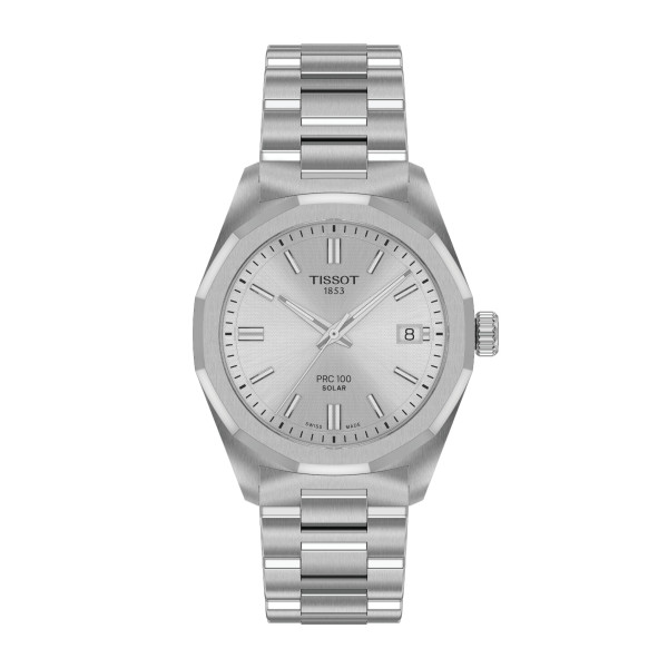 Diese Tissot PRC 100 Solar Quartz 34mm Ausführung besitzt ein silberfarbenes Zifferblatt mit Datumsanzeige. Das ebenso massive wie flexible 316L-Edelstahlarmband mit Butterfly-Faltschließe mit Drückern hält die Uhr sicher am Handgelenk.