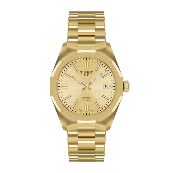 Mit seinem 34 Millimeter messenden 316L-Edelstahlgehäuse mit goldfarbener PVD-Beschichtung und der markanten, zwölfeckigen Lünette strahlt dieses Tissot PRC 100 Solar Quartz 34mm Modell Selbstbewusstsein aus. Unter dem flachen, sehr kratzfesten Saphirglas liegt ein solarbetriebenes Quarzwerk, das sich sowohl bei natürlichem als auch bei künstlichem Licht mühelos auflädt. Erreicht der Akkustatus ein niedriges Level, bleibt dies dank der End-of-Energy-Anzeige nicht unbemerkt.