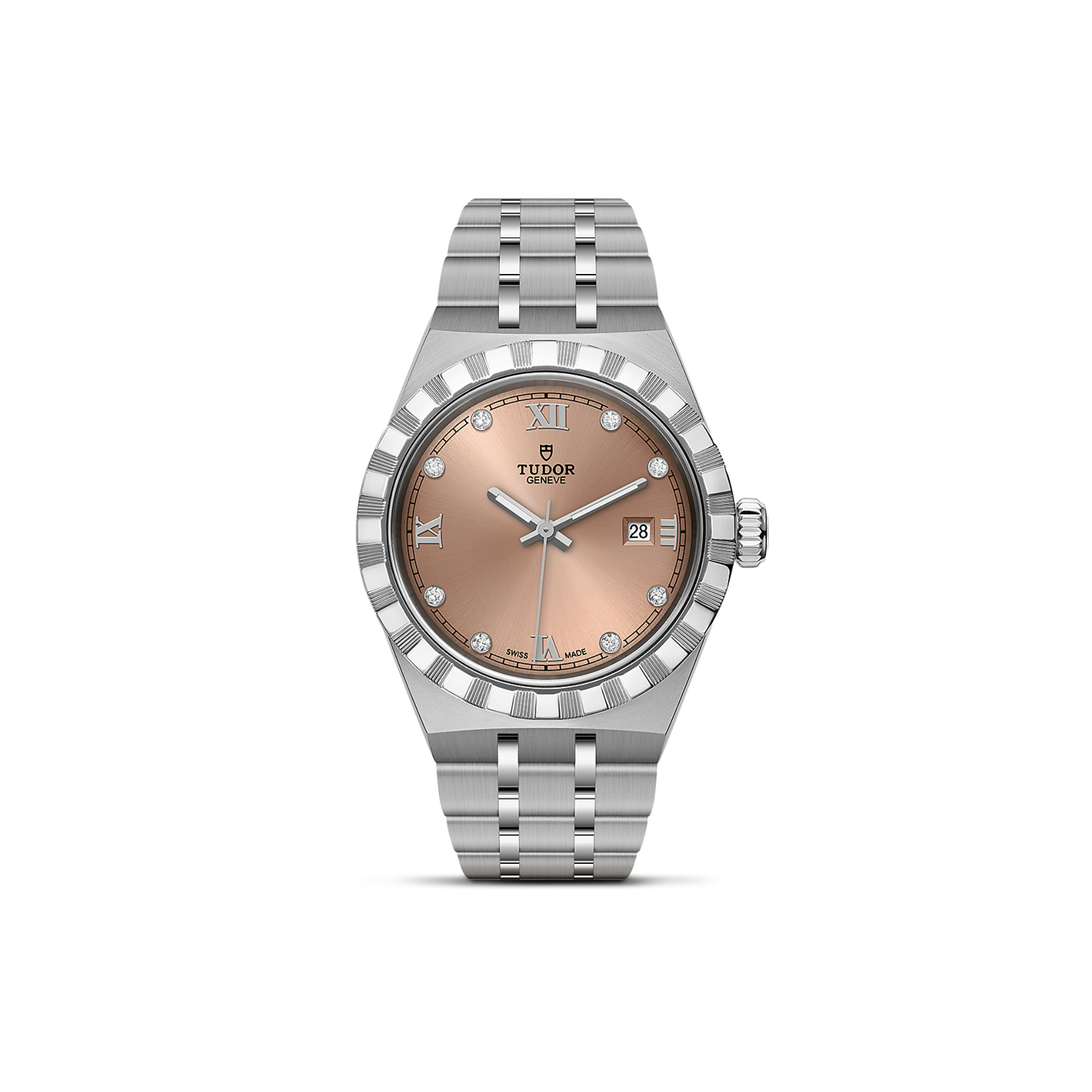 Ref. M28300-0010 - TUDOR hat die Auswahl an Zifferblättern der beliebten Royal Linie um ein lachs- sowie ein schokoladenfarbenes Zifferblatt im Sonnenschliff erweitert, die durch eine überraschende und erlesene Optik überzeugen. Die Royal Linie bietet sportliche und schicke Uhren mit Selbstaufzug sowie integrierten Armbändern, die sich durch Erschwinglichkeit und Eleganz gleichermaßen auszeichnen. Eine herausragende technische Leistung und eine raffinierte Ästhetik; diese Linie verkörpert eine Mischung aus klassischer Armbanduhr und Sportuhr. Der Name „Royal“ wurde von TUDOR erstmals in den 1950er-Jahren verwendet, um die herausragende Qualität seiner Armbanduhren hervorzuheben, die bis heute Bestand hat. Die Royal ist in Edelstahl oder in Gelbgold und Edelstahl sowie in vier Größen mit insgesamt dreizehn verschiedenen Zifferblättern für jeden Geschmack erhältlich. Alle Zifferblätter verfügen über diese applizierten Ziffern oder eine Kombination aus applizierten Ziffern und acht Diamantindizes.