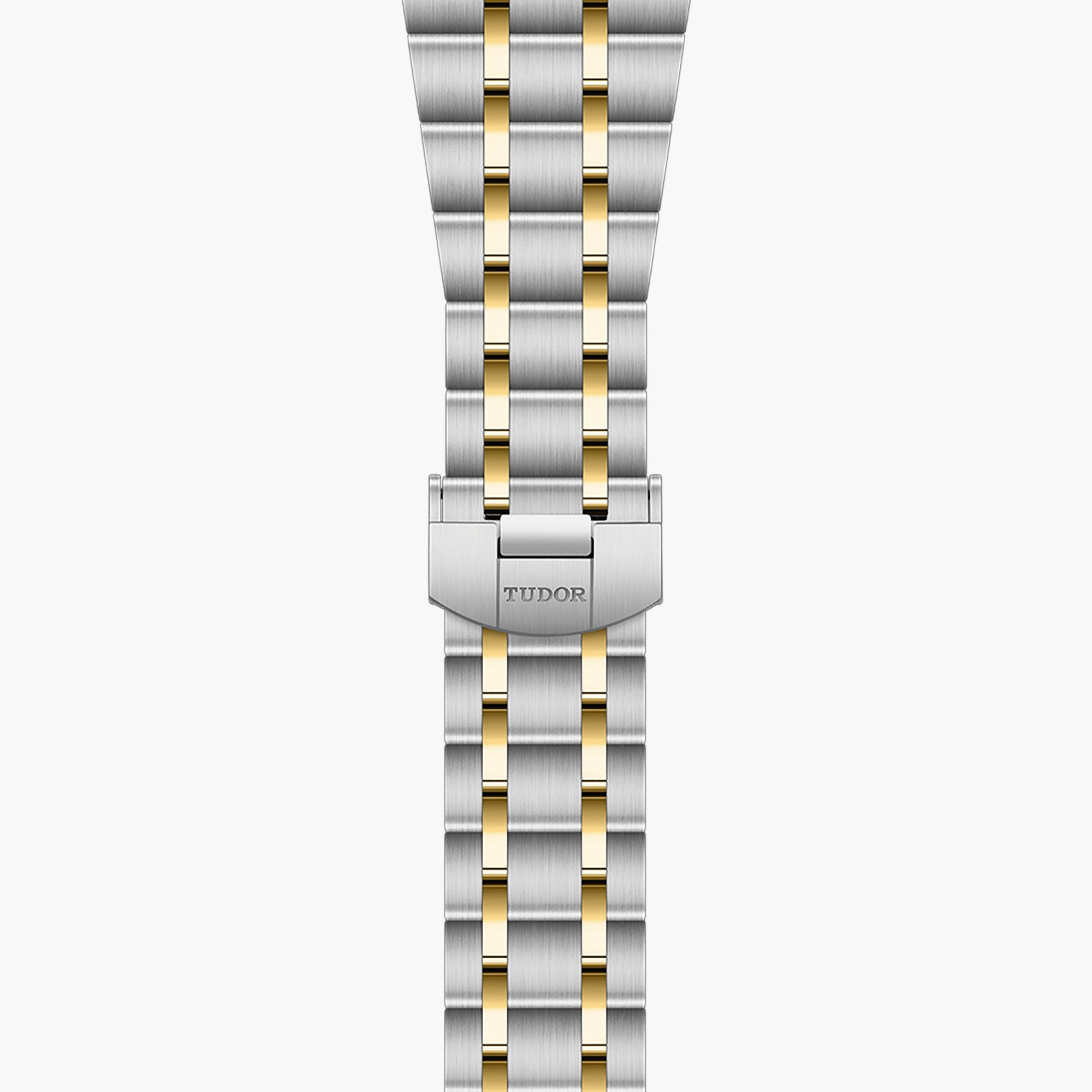 Integiertes Armband aus Edelstahl 316L und 18K Gelbgold mit Sicherheitsfaltschließe, fünfreihig, satinierte Elemente außen und innen, polierte Elemente dazwischen